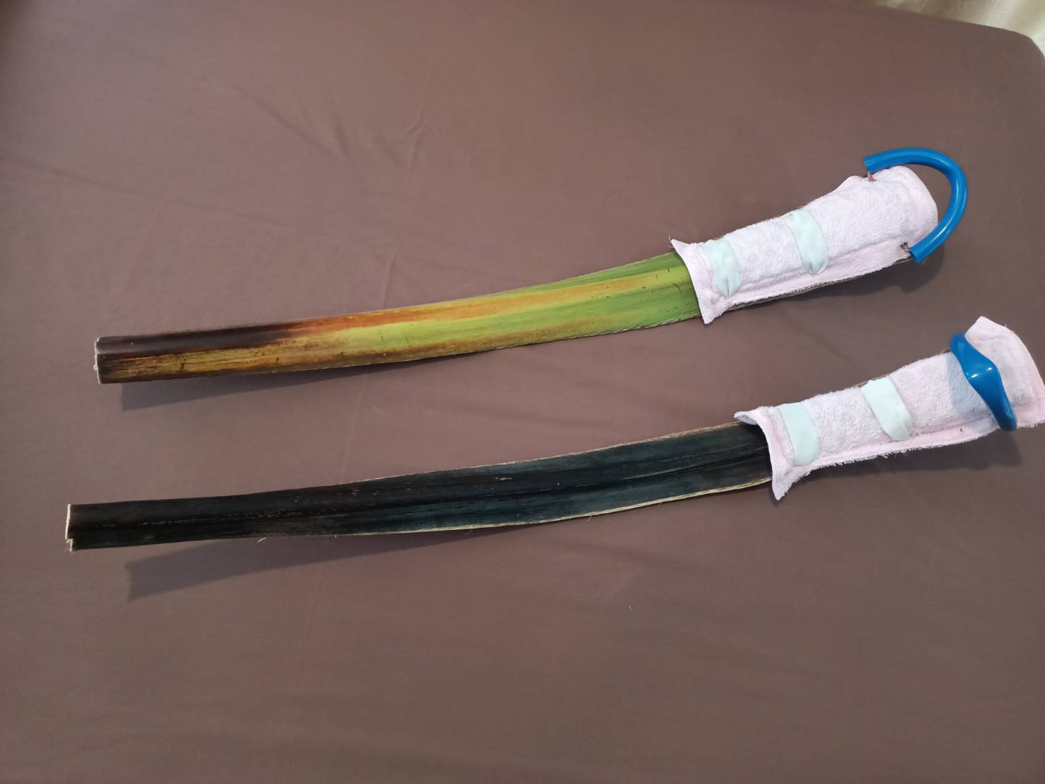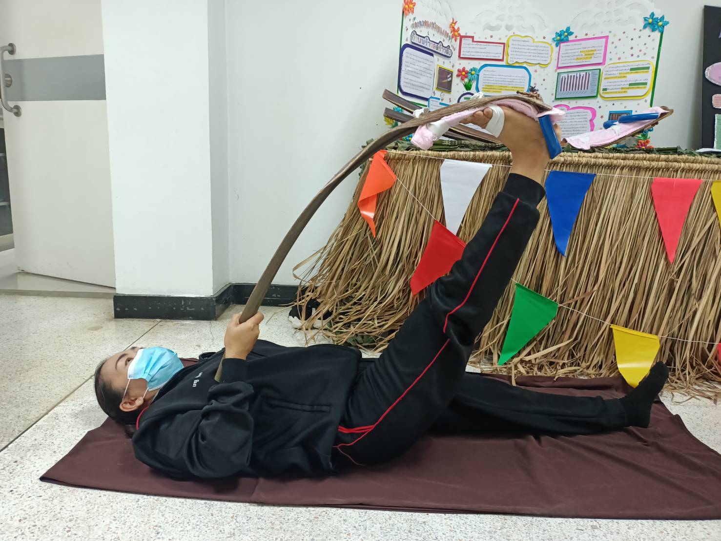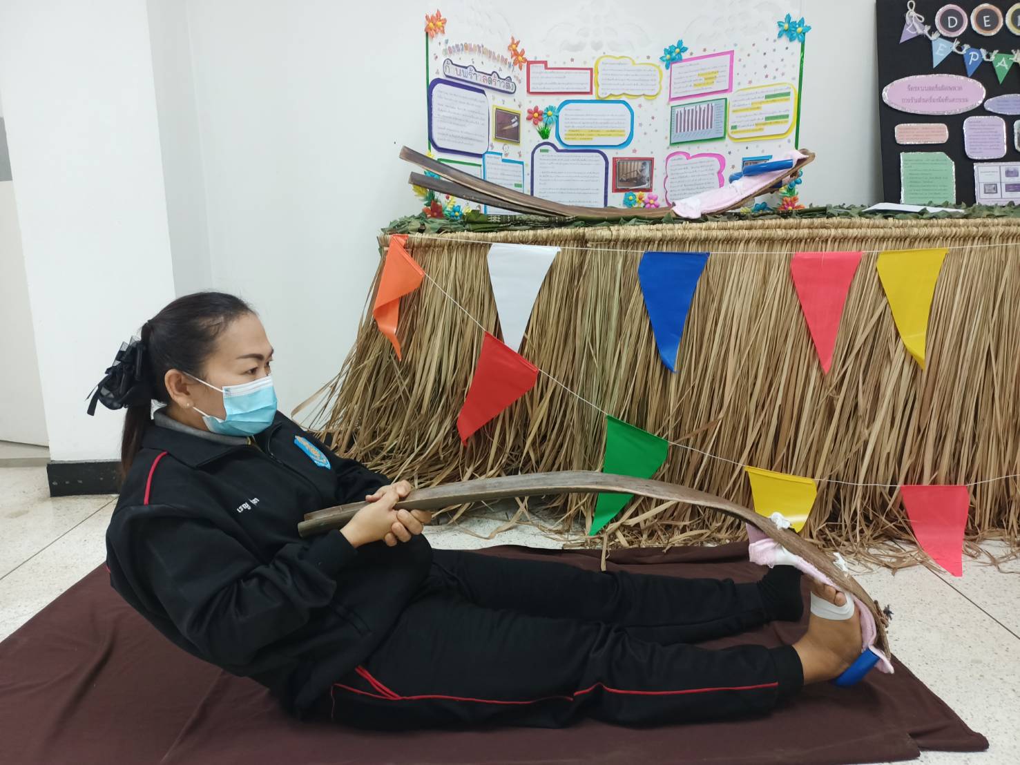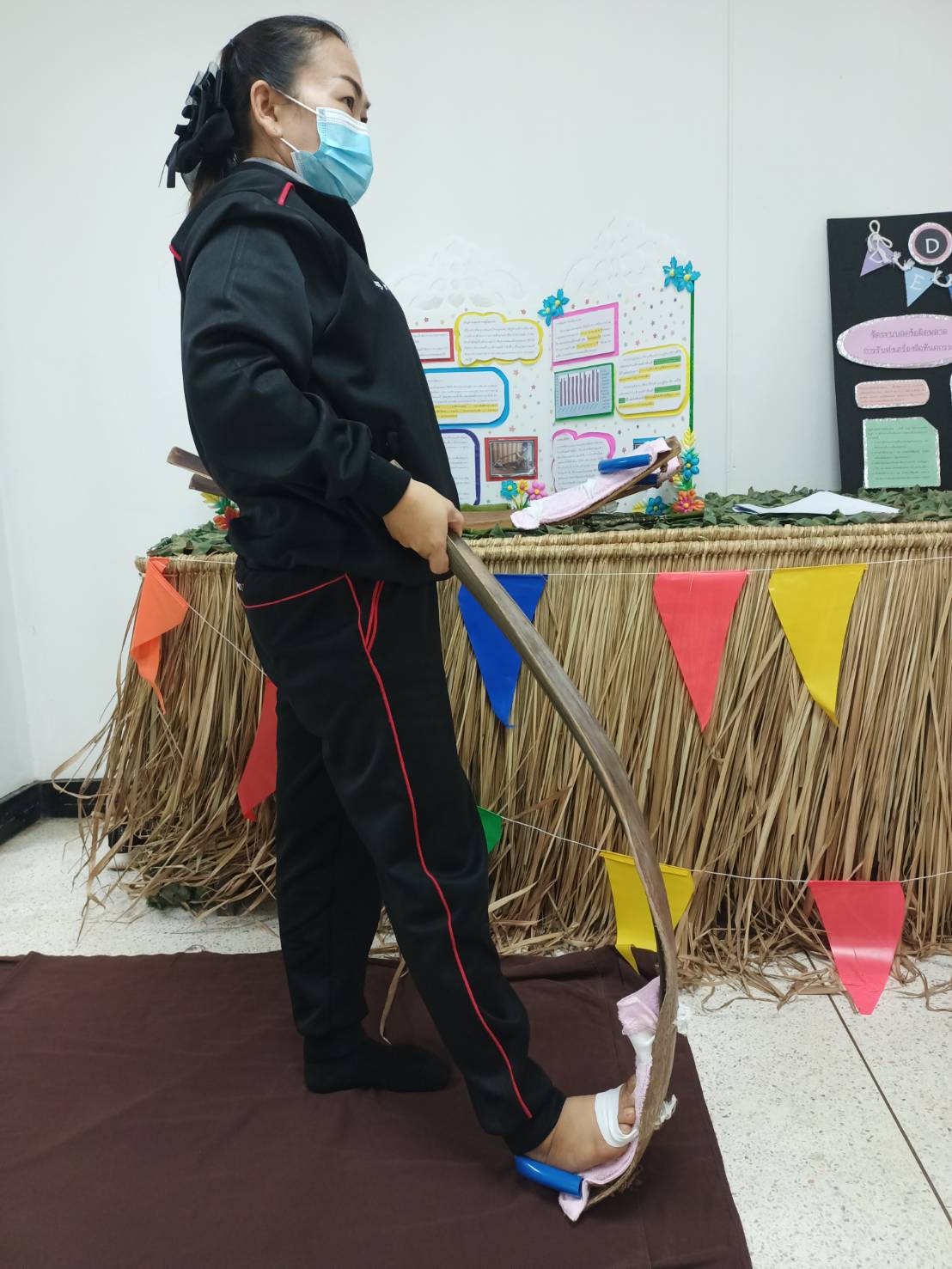 เป็นนวัตกรรมที่หาง่ายในทุกพื้นที่ เป็นวัสดุที่หาได้จากธรรมชาติ ประหยัด และสามารถทำได้เอง โดยส่วนประกอบ คือ 1.ก้านมะพร้าว 2.เชือกไนล่อน 3.ยางยืดสีขาวขนาด1นิ้ว 4.ผ้าขนหนู/ผ้าที่ไม่ใช้แล้ว 5.ตาไก่ 6.แผ่นยางกันลื่น 7.สายยาง(สายยางรดน้ำ) 8.กระดาษทราย โดยมีวิธีการทำคือ ตัดก้านมะพร้าวขนาดประมาณ1เมตร25เซนติเมตร ตากก้านมะพร้าวให้แห้ง ใช้กระดาษทรายขัดด้านข้างก้านมะพร้าวเพื่อทำให้ไม่เกิดเสี้ยน นำไปเจาะรูตรงโคนก้าน 3 จุดทั้งทางด้านซ้ายและขวาของโคนก้าน โดยแต่ละจุดบน-ล่างห่างกันประมาณ 4 นิ้ว ตัดผ้าให้เป็นสี่เหลี่ยมจัตุรัสนำผ้าพับทบกันโดยสอดแผ่นยางกันลื่น(ใช้ปุ่มกันลื่นพลิกไว้ข้างบน) วางไว้ตรงกลางของผ้าและเย็บล็อกแผ่นกันลื่นและเย็บขอบทั้ง4มุมของผ้า จากนั้นเจาะรูผ้าและใส่ตาไก่โดยวัดขนาดตามรูของก้านมะพร้าวที่เจาะไว้ วางทาบบนก้านมะพร้าวเพื่อจะนำยางยืดและเชือกไนล่อนตรึงไว้ นำยางยืดอ้อมรูทั้ง 2 ฝั่งมัดเข้าหากันให้แน่น โดยมัดบริเวณจุดบนสุดและจุดกลางของก้านมะพร้าว จากนั้นตัดสายยางให้ขนาดพอดีที่จะสามารถล็อกส้นเท้าเพื่อกันส้นเท้าเจ็บ นำเชือกไนล่องใส่ลอดไปในสายยางที่ตัดไว้แล้ว ตัดเชือกให้มีขนาดยาวกว่าสายยาง นำเชือกไนล่อนอ้อมรูทั้ง 2 ฝั่งมัดเข้าหากันให้แน่นร้อยตรงจุดปลายหรือจุดโคนของก้านมะพร้าว เป็นอันเสร็จสิ้น