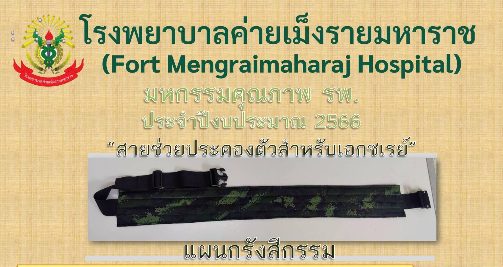 เนื่องจากมีผู้ป่วยสูงอายุเคลื่อนไหวตัวลำบากและขึ้นเตียงได้ยาก ญาติผู้ป่วย/เจ้าหน้าที่ต้องคอยมาช่วยประคองตัวทำให้เสี่ยงต่อการได้รับรังสีมากเกินความจำเป็น ผู้ป่วยไม่มีญาติคอยช่วยประคองตัวขณะถ่ายภาพเอกซเรย์ เจ้าหน้าที่ปฏิบัติงานนอกเวลามีจำนวนน้อย การจัดท่าผู้ป่วยค้อนข้างยาก ผู้ป่วยอยู่ไม่นิ่ง มีการขยับตัวขณะเอกซเรย์ ทำให้ภาพถ่ายเอกซเรย์ไม่ชัดเจน จึงมีการคิดค้นนวัตกรรม สายช่วยประคอมตัวสำหรับ X-ray ขึ้นมา เพื่อให้ เจ้าหน้าที่ปฏิบัติงานนอกเวลาสามารถจัดท่าผู้ป่วยที่เคลื่อนไหวตัวลำบากให้ทำงานได้สะดวกข
