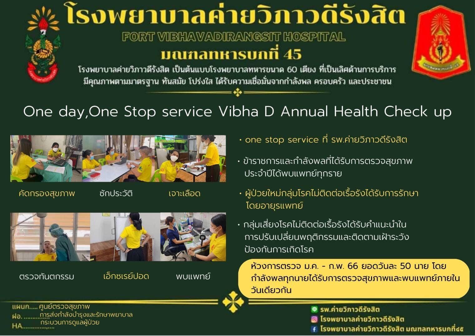 การตรวจสุขภาพประจำปีให้แก่กำลังพลภายในหน่วยค่ายวิภาวดีรังสิต ระบบ one day,one stop service กำลังพลทุกนาย จะได้รับการตรวจสุขภาพ ฟังผลการตรวจ และ พบแพทย์ในวันเดียวกัน ทำให้ค้นหากลุ่มเสี่ยง กลุ่มป่วย เพื่อเข้าสู่ระบบการรักษาได้ทันท่วงที และ ได้รับคำแนะนำได้การดูแลสุขภาพจากแพทย์ รพ.ค่ายวิภาวดีรังสิต