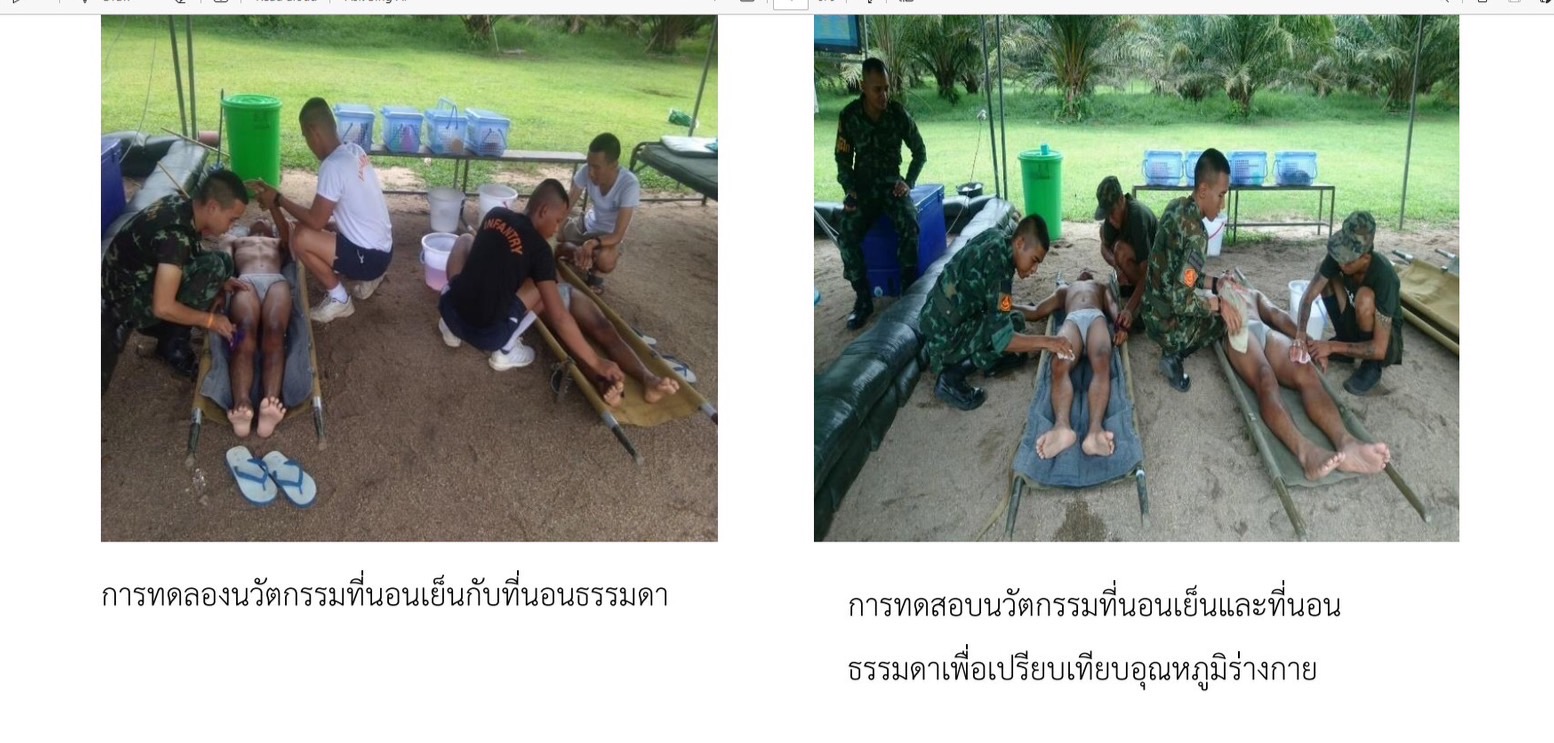 นวัตกรรมที่นอนเย็นลดอุณหภูมิกายทหาร (ICE JEL BED) เพื่อใช้สำหรับลดอุณหภูมิร่างกายโดยการปูรองร่างกายผู้ป่วยพร้อมกับการเช็ดตัวลดอุณหภูมิในเวลาเดียวกัน ทำให้ผู้ป่วยได้รับการลดอุณหภูมิได้ทันท่วงที ลดการเจ็บป่วยจากโรคลมร้อน