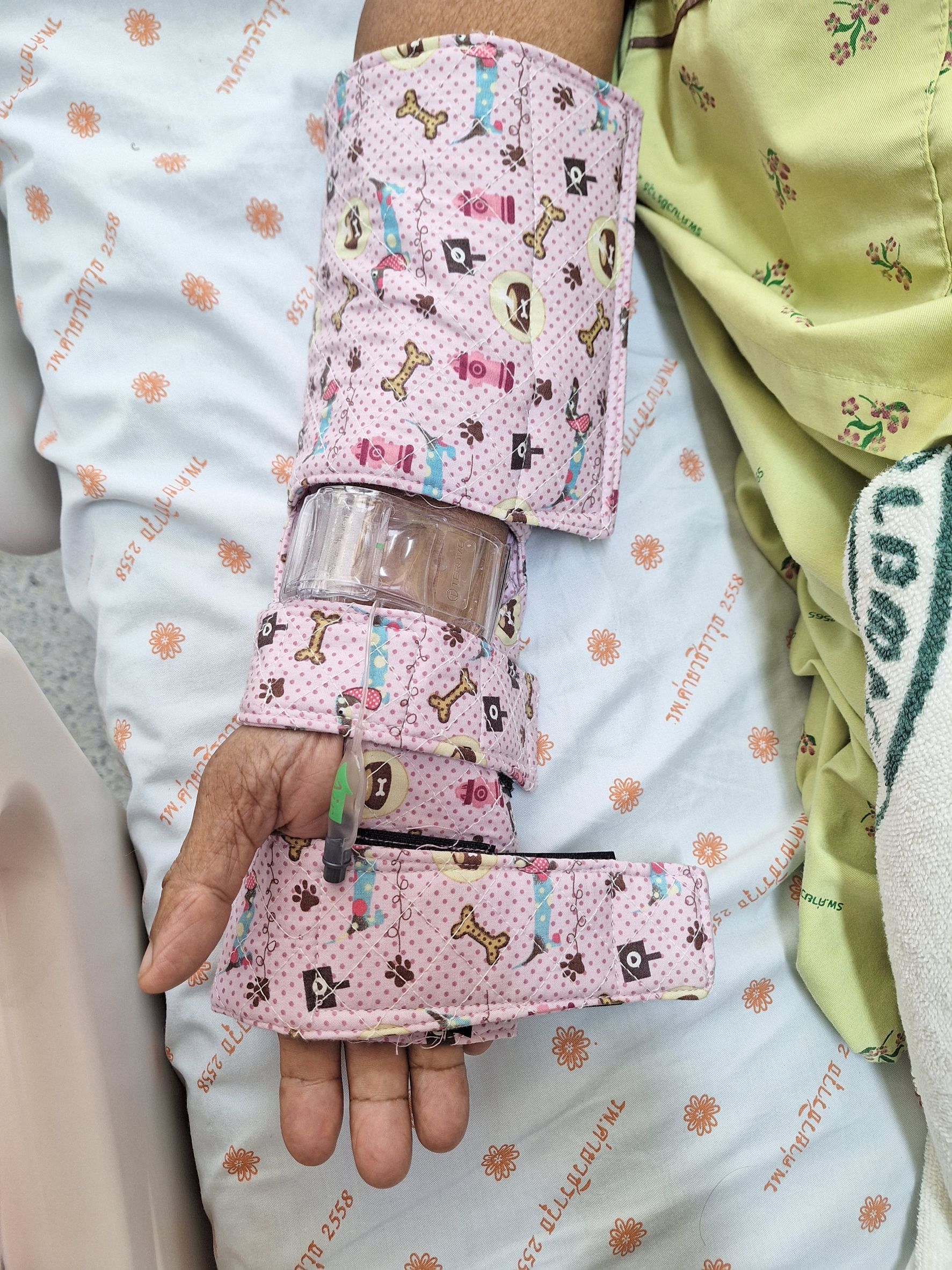 เพื่อช่วยประคองแขน ลดภาวะเสี่ยงต่อการเกิด Bleeding/Hematoma บริเวณที่ทำ ช่วยป้องกันไม่ให้สาย A-line หัก พับ งอ และช่วยให้เจ้าหน้าที่มีความสะดวกใน การดูแลผู้ป่วยมากขึ้น เพื่อให้ผู้ป่วยลดความวิตกกังวล ไม่ต้องคอยระมัดระวังตลอดเวลา