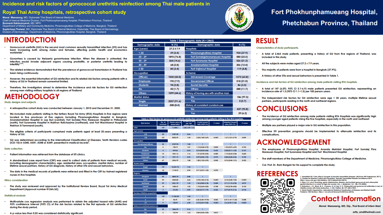Incidence and risk factors of gonococcal urethritis reinfection among Thai male patients in Royal Thai Army hospitals, Retrospective cohort study