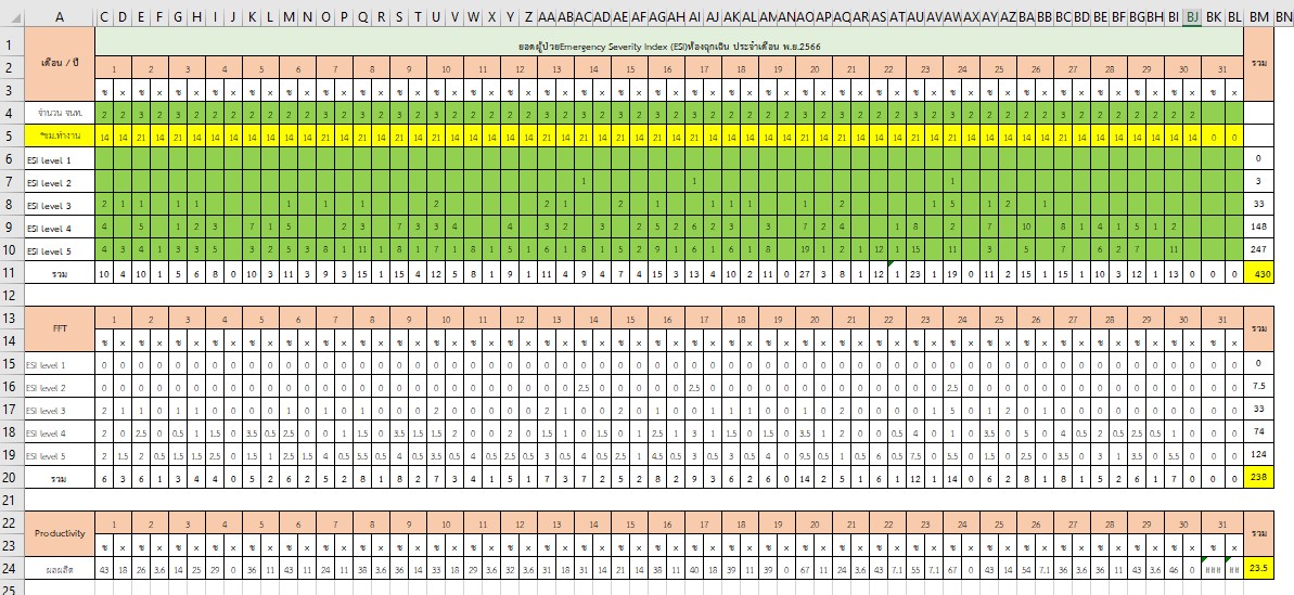 การคำนวณภาระงานพยาบาล (Nursing Productivity ) มีความสำคัญในการวางแผนการบริหารบุคคลในแผนกพยาบาล โดยนำผลผลิตทางการพยาบาลแต่ละจุดบริการวางแผนการจัดสรรอัตรากำลังให้เหมาะสม ห้องฉุกเฉินมีการแบ่งประเภทผู้ป่วยตาม Emergency Severity Index (ESI) ซึ่งผู้ป่วยแต่ละระดับมีชั่วโมงการพยาบาลต่างกันไป ทำให้การคำนวณภาระงานพยาบาลยุ่งยาก ซับซ้อน ดังนั้นจึงใช้โปรแกรม Microsoft Excel มาช่วยในการคำนวณภาระงาน โดยเจ้าหน้าที่สามารถบันทึกจำนวนผู้ป่วย,ประเภทผู้ป่วยประเภทหัตถการ แล้วสามารถคำคำนวณภาระงานแบบอัตโนมัติได้ ไม่ต้องมาคิดคำนวณรายวัน