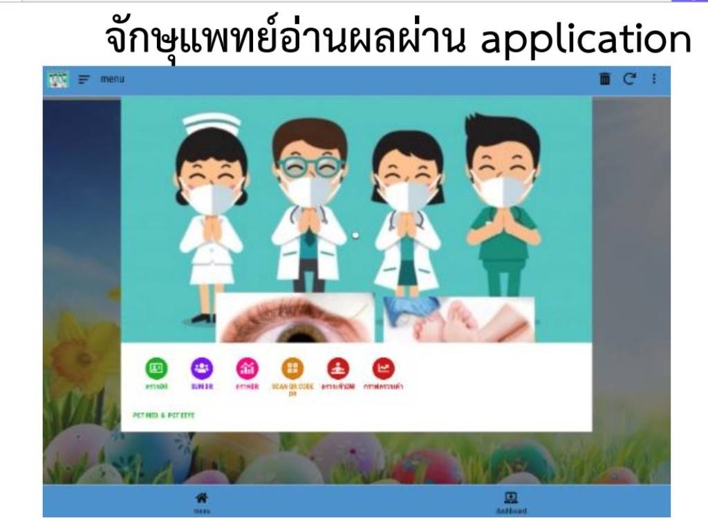 แอปพลิเคชั่นห้องตรวจโรคตาเชื่อมต่อฐานข้อมูลผู้ป่วยภายหลังถ่ายภาพจอประสาทตา จักษุแพทย์สามารถเข้าดูภาพถ่ายและอ่านผลได้แบบ Real time ข้อมูลเก็บไว้ในระบบฐานข้อมูลผู้ป่วย Google Drive