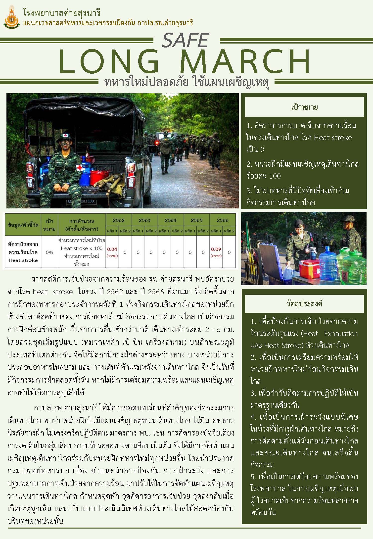 กวปส.รพ.ค่ายสุรนารี ได้มีการถอดบทเรียนที่สาคัญของกิจกรรมการเดินทางไกล พบว่า หน่วยฝึกไม่มีแผนเผชิญเหตุขณะเดินทางไกล ไม่มีนายทหารนิรภัยการฝึก ไม่เคร่งครัดปฏิบัติตามมาตรการ พบ. เช่น การคัดกรองปัจจัยเสี่ยง การงดเดินในกลุ่มเสี่ยง การปรับระยะทางตามสีธง เป็นต้น จึงได้มีการจัดทาแผนเผชิญเหตุเดินทางไกลร่วมกับหน่วยฝึกทหารใหม่ทุกหน่วยขึ้น โดยนาประกาศกรมแพทย์ทหารบก เรื่อง คาแนะนาการป้องกัน การเฝ้าระวัง และการ ปฐมพยาบาลการเจ็บป่วยจากความร้อน มาปรับใช้ในการจัดทาแผนเผชิญเหตุ วางแผนการเดินทางไกล กาหนดจุดพัก จุดค