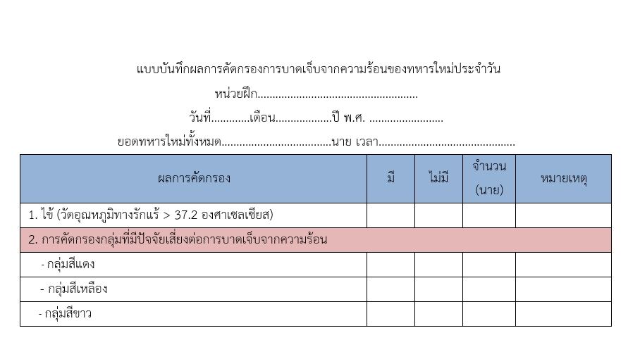 การพัฒนาแบบบันทึกผลการคัดกรองการบาดเจ็บจากความร้อนของทหารใหม่ประจำวัน
