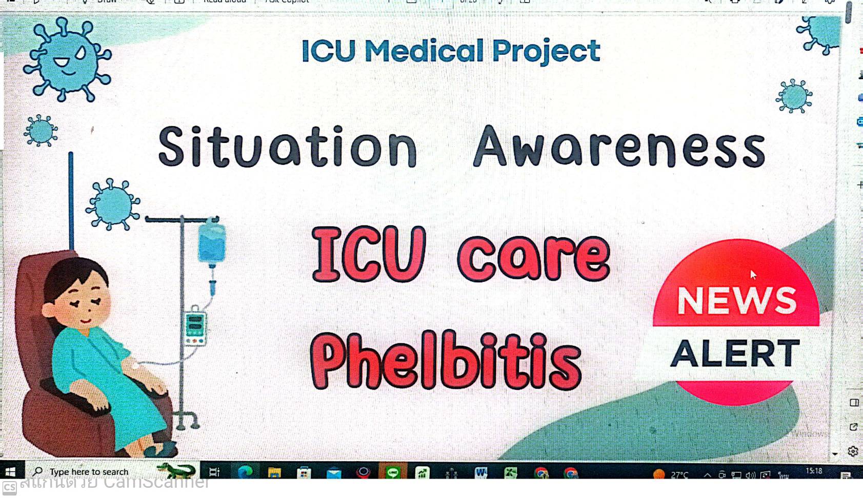 ICU Care Phlebitis มีวัตถุประสงค์เพื่อศึกษาปัจจัยเสี่ยงรายบุคคลที่ส่งผลให้ผู้ป่วยเกิด Phlebitis ช่วยลดอัตราการเกิด Phlebitis ในหอผู้ป่วย ICU และเป็นการพัฒนาการดูแลผู้ป่วยเพื่อป้องกันการเกิด Phlebitis แบบบูรณาการ โดยเน้นการจัดทำระบบการเก็บข้อมูลสถิติและนำมาวิเคราะห์ปัจจัยที่ทำให้เกิดจนสามารถสร้างเป็นเครื่องมือในการปฏิบัติงานเพื่อการดูแลในกลุ่มผู้ป่วยที่ต้องให้ยาหรือให้สารน้ำทางหลอดเลือดดำ