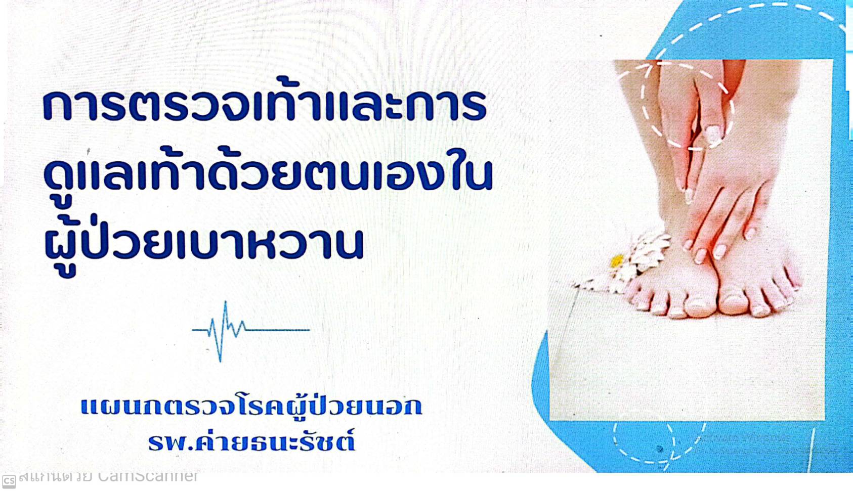 อุบัติการณ์การเกิดแผลที่เท้าในผู้ป่วยเบาหวาน มีอัตราการเกิดเพิ่มสูงขึ้นทุกปี โดยเฉพาะอย่างยิ่งในกลุ่มผู้ที่ไม่สามารถควบคุมระดับน้ำตาลในเลือดได้ ซึ่งเป็นสาเหตุที่ทำให้เกิดความเสื่อมของปลายประสาทที่เท้า ประกอบกับต่อมเหงื่อทำงานผิดปกติและมีผิวหนังแห้ง ผู้ที่เป็นโรคเบาหวานเป็นระยะเวลานานจึงเกิดบาดแผลได้ง่ายและหายยาก เสี่ยงต่อการตัดนิ้ว ตัดเท้ากิจกรรมนี้มีวัตถุประสงค์เพื่อให้ผู้ป่วยเบาหวานสามารถดูแลเท้าและตรวจเท้าด้วยตนเองในเบื้องต้นเพื่อหาความผิดปกติและส่งต่อข้อมูลให้เจ้าหน้าที่ผ่านทางระบบ Google Fo