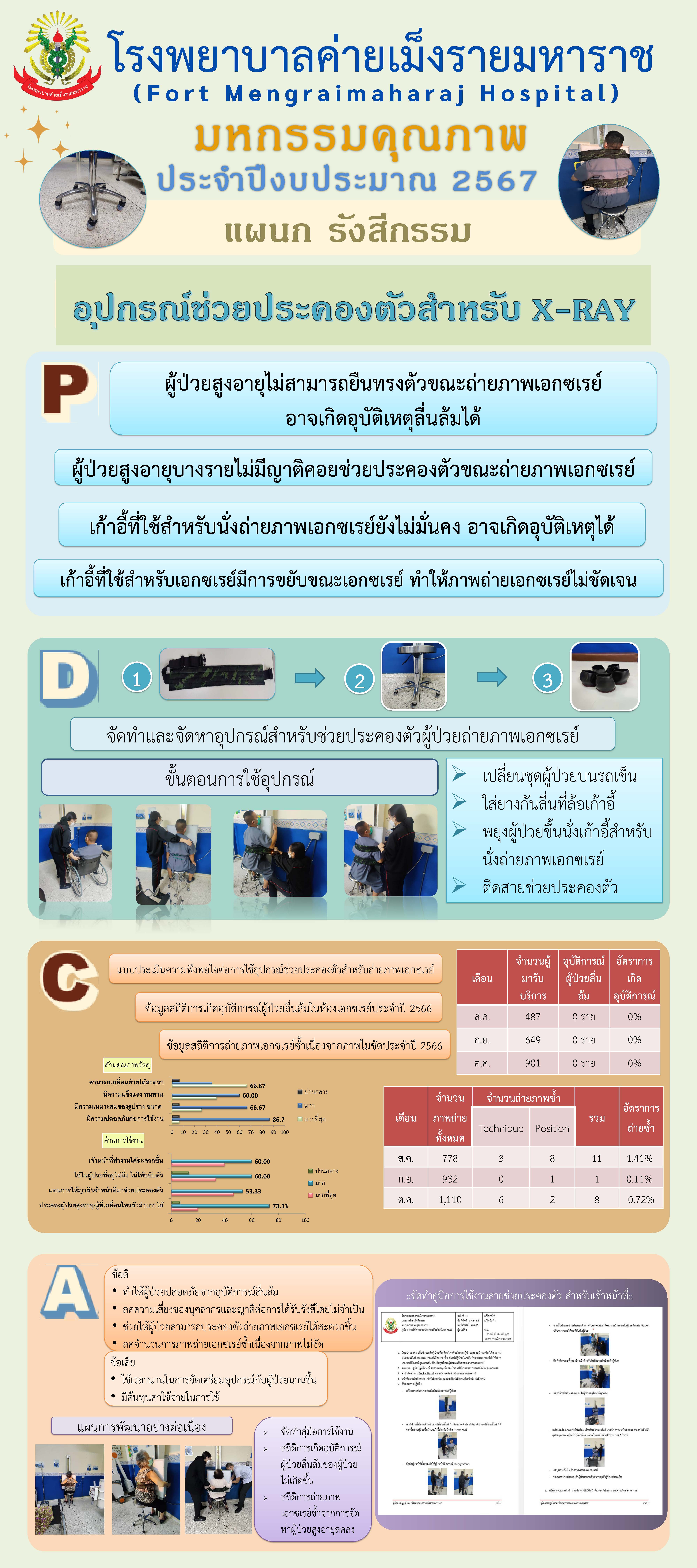 ปัจจุบันพบว่ามีผู้ป่วยสูงอายุเพิ่มมากขึ้นที่มาใช้บริการที่ รพ.ค่ายเม็งรายฯ และผู้ป่วยแต่ละรายจะได้รับการตรวจ Chest เอกซเรย์ประจำปี เกือบทุกรายจึงทำให้พบว่ามีผู้ป่วยสูงอายุมารับบริการที่ห้องเอกซเรย์เป็นประจำมาก และพบว่ามีผู้ป่วยสูงอายุที่ต้องนั่งรถเข็น ใช้ไม้เท้าหรือใช้ Walker ช่วยพยุงเดินมารับบริการถ่ายภาพเอกซเรย์ ทำให้พบปัญหาในการจัดท่าผู้ป่วยให้ถ่ายภาพเอกซเรย์ได้ และในผู้ป่วยบางรายไม่มีญาติที่คอยให้การช่วยเหลือ จึงได้จัดทำอุปกรณ์สำหรับช่วยประคองตัวผู้ป่วยให้เอกซเรย์ได้สะดวกและปลอดภัยมากขึ้น