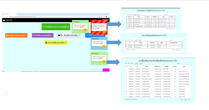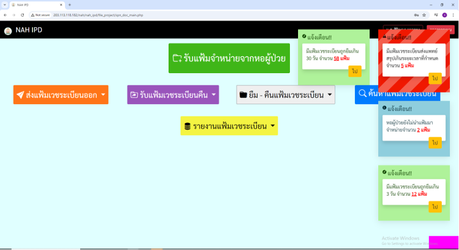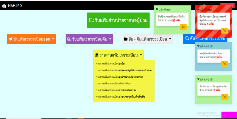 โปรแกรม NAH IPD Record สามารถแจ้งเตือนสถานะต่างๆ เช่น มีแฟ้มเวชระเบียนถูกยืมเกิน 3 วัน จำนวน 12 แฟ้ม , มีแฟ้มเวชระเบียนส่งแพทย์สรุปเกินระยะเวลาที่กำหนด จำนวน 5 แฟ้ม , มีแฟ้มที่ยังไม่จำหน่ายจากหอผู้ป่วยกี่แฟ้ม จากตึกไหนบ้าง และสามารถรายงานสถานะเก็บขึ้นชั้น เป็นต้น