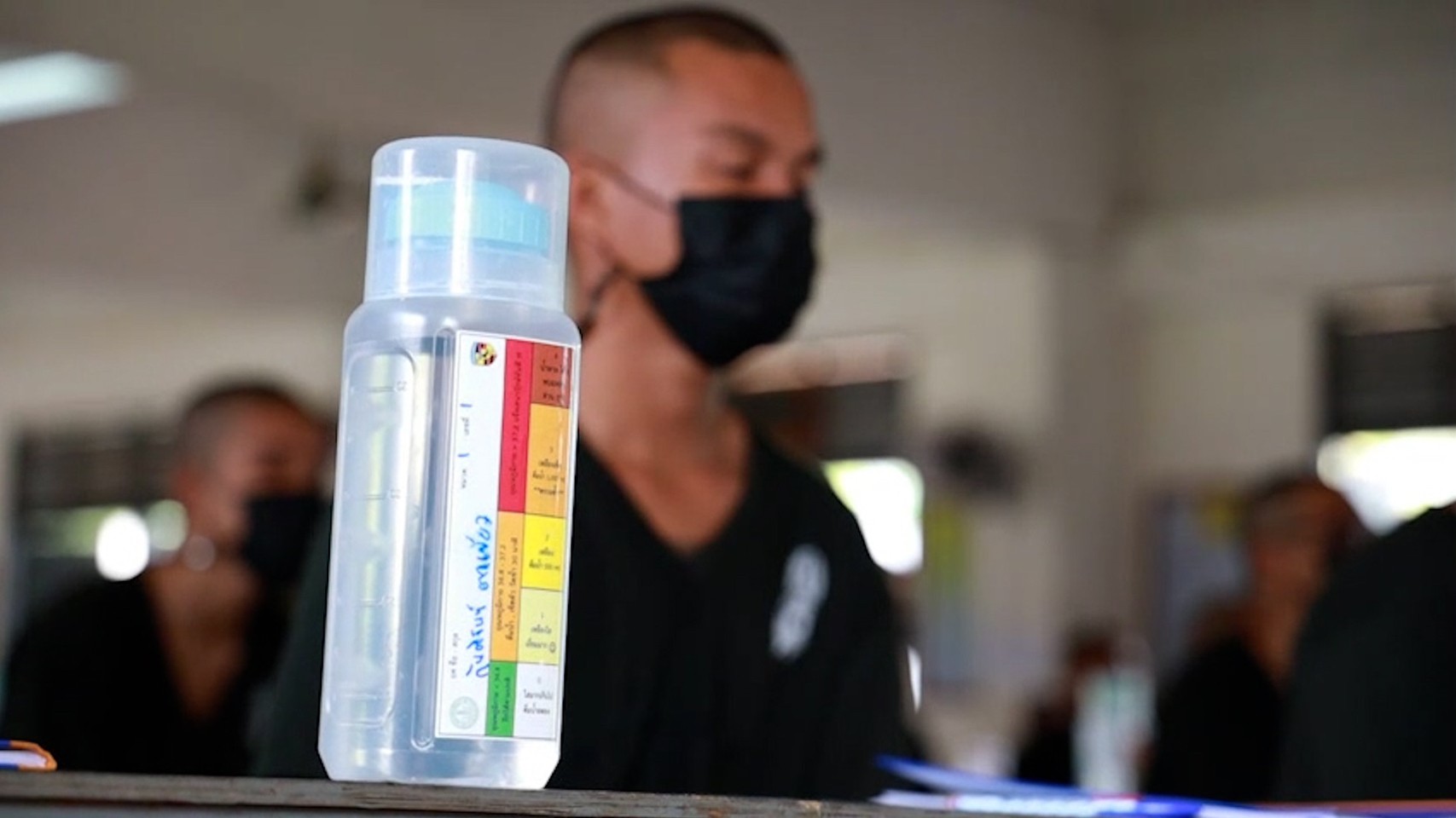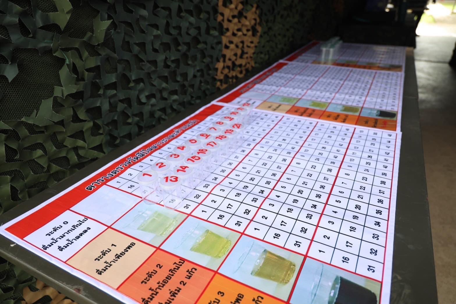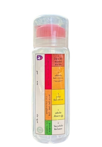 โดยในขวดน้ำจะมีการติดสติ๊กเกอร์ที่บอกระดับสีปัสสาวะ และค่าดัชนีความร้อน ที่มีระดับน้ำที่จะต้องดื่มเพิ่มเติมดังนี้