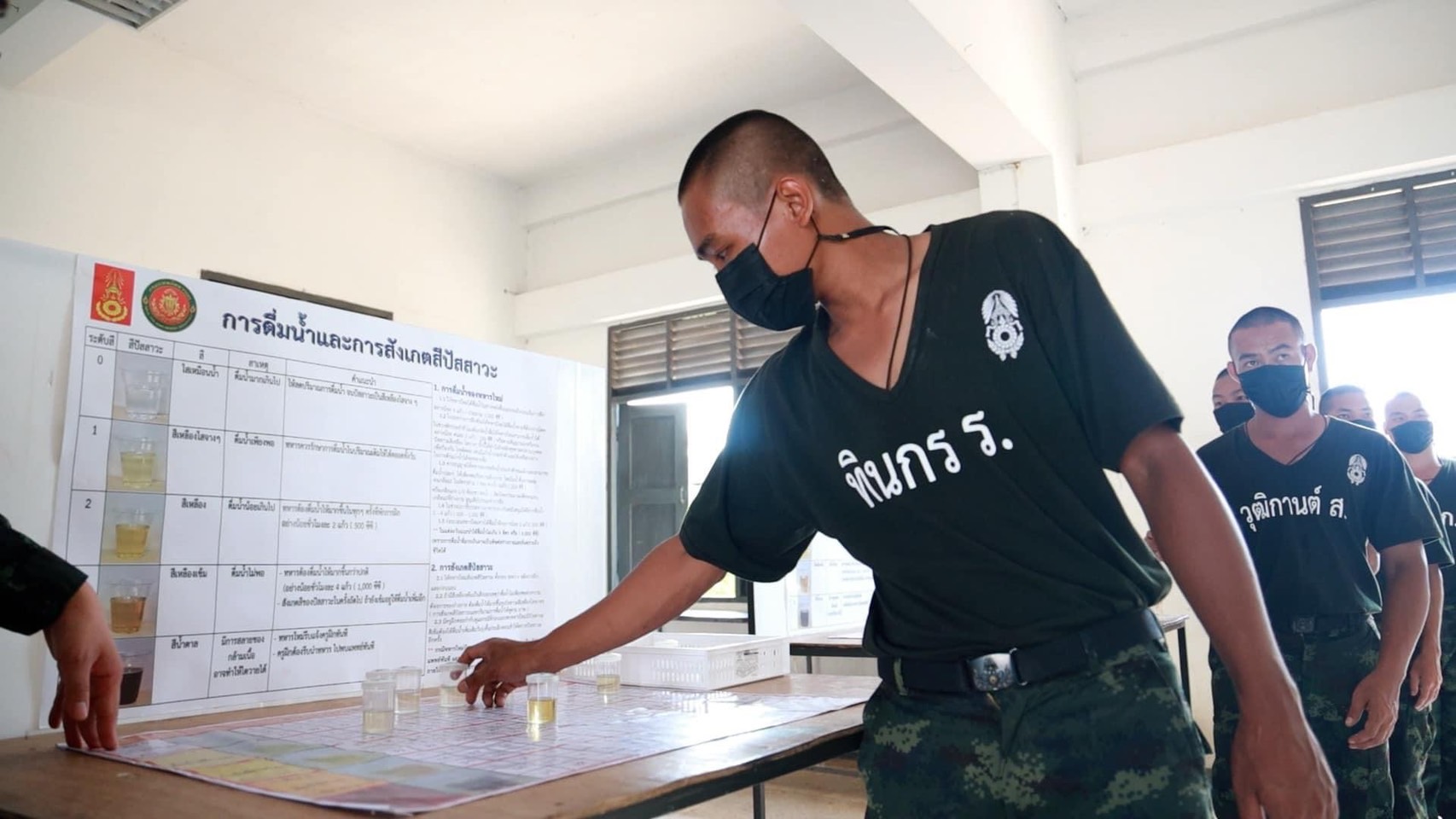 ทหารใหม่ต้องดื่มน้ำให้มากขึ้นกว่าปกติ อย่างน้อยชั่วโมงละ 4 แก้ว (1,000 ซีซี) สังเกตสีปัสสาวะในครั้งถัดไป ถ้ายังเข้มอยู่ให้ดื่มน้ำเพิ่มอีก |