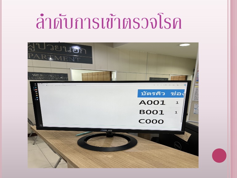 เนื่องจากมีผู้รอรับบริการตรวจโรคเป็นจำนวนมากบริเวณหน้าห้องตรวจและไม่ทราบถึงลำดับการเข้าตรวจโรคของตน ทำให้เกิดความไม่พึงพอใจและคับคั่งวุ่นวายบริเวณหน้าห้องตรวจโรคจึงได้จัดให้มีลำดับคิวในการเข้าห้องตรวจโรคแต่ละห้อง โดยหลังจากที่ผู้ป่วยได้รับการซักประวัติเรียบร้อยแล้วจะได้รับบัตรคิวแสดงลำดับในการเข้าห้องตรวจโรคและสามารถตรวจสอบลำดับการเข้าห้องตรวจโรคจากหน้าจอแสดงลำดับการรอเข้าห้องตรวจโรคหรือ Scan QR Code s ตรวจสอบลำดับในการรอเข้าห้องตรวจโรคของตนเองได้ เพื่อให้ผู้มารับบริการสามารถจัดสรรเวลาในการมารอรับการตรวจที่หน้าห้องตรวจโรคได้ด้วยตนเอง จากการใช้ระบบคิวแสดงการเข้าตรวจโรคพบว่าผู้รับมีความพึงพอใจในระยะเวลาการรอคอย และข้อซักถามในลำดับการเข้าห้องตรวจโรคลดลงเป็นอย่างมาก ผู้ป่วยพึงพอใจและยินดีรอคอยตามลำดับการเข้าตรวจโรค