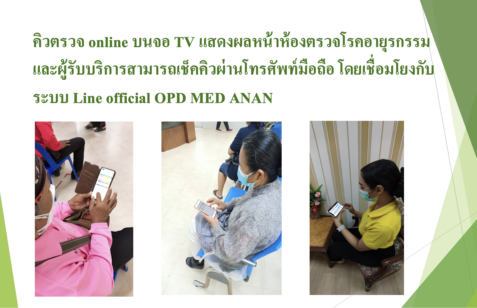 ระบบแจ้งคิวรอพบแพทย์ แสดงข้อมูล online ผ่านจอ TV บริเวณหน้าห้องตรวจโรคอายุรกรรม และผู้รับบริการสามารถเช็คคิวผ่านอุปกรณ์สมาร์ทโฟน โดยเชื่อมโยงกับระบบ Line official OPD MED ANAN โดยประยุกต์ใช้ Looker Studio (Google data studio) ในการสร้าง