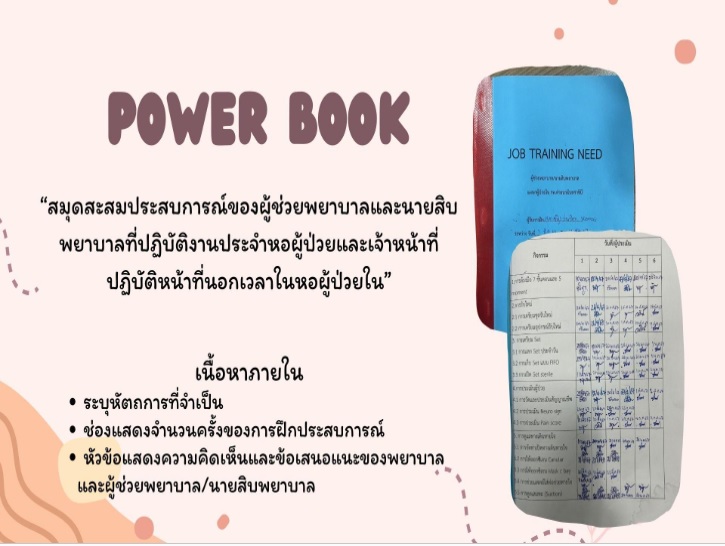 4. สรุปผลการวิเคราะห์สาเหตุของปัญหา จากการวิเคราะห์การปฏิบัติงานและปํญหาที่พบ ผู้ช่วยพยาบาล/นายสิบพยาบาลบรรจุใหม่ที่ฝึกปฏิบัติงานแผนกผู้ป่วยใน ขาดทักษะและประสบการณ์ในการปฏิบัติงาน ขาดความมั่นใจและความคล่องแคล่วในการทำหัตถการเบื้องต้น ใช้เวลาในการขึ้นฝึกปฏิบัติงานนอกเวลา (เวรคู่)นาน ส่งผลให้ผู้ปฏิบัติงานร่วมเวรรับภาระและเกิดความไม่เชื่อมั่นในการปฏิบัติงานร่วม และยังขาดทรัพยากรบุคคลในการปฏิบัติงานนอกเวลา และ รพ.สูญเสียเงินในการจ้างเพิ่ม จึงได้จัด POWER BOOK ซึ่งเป็นสมุดมีเป้าหมายในการเก็บประสบการณ์ในการทำหัตถการและสอบถามความรู้ร่วมด้วย สามารถแก้ปัญหาเรื่องการขาดทักษะในการทำหัตถการเบื้องต้นของผู้ช่วยพยาบาล/นายสิบพยาบาล ได้เป็นอย่างดี |