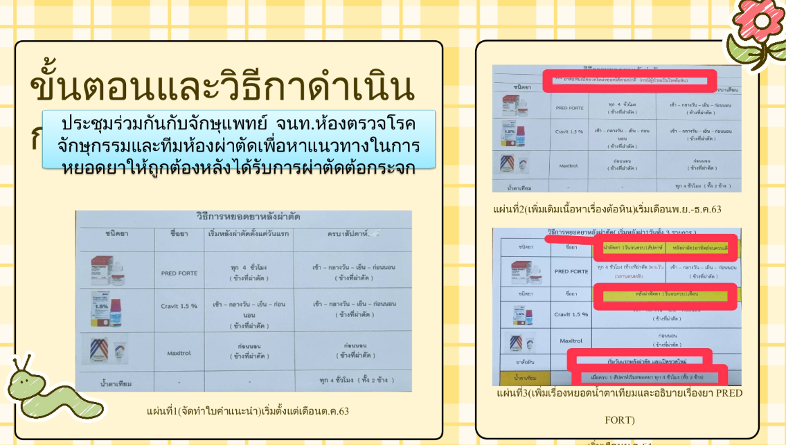 ปรับปรุง ตามคำแนะนำและข้อผิดพลาดที่เกิดขึ้น เช่น ไม่หยอดยาน้ำตาเทียมเมื่อครบกำหนด
