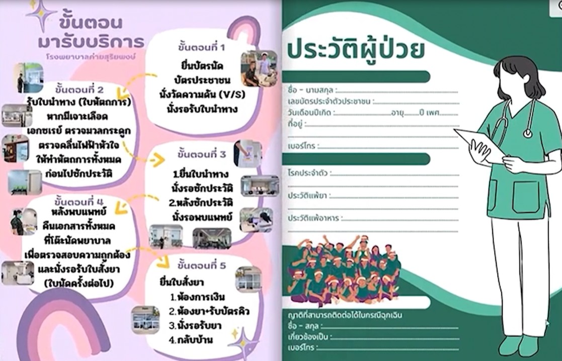 สมุดบันทึกสุขภาพเล่มนี้ใช้สำหรับบันทึกสุขภาพผู้ป่วย แนวทางขั้นตอนรับบริการ รวมถึงคำแนะนำต่างๆ สมุดบันทึกสุขภาพเล่มนี้ถูกปรับใช้ให้เหมาะสมกับทุกโรค ทุกวัย และยังสามารถนำไปใช้ได้กับทุกโรงพยาบาล เมื่อเกิดเหตุกรณีฉุกเฉิน หมดสติ เพื่อให้เข้าถึงข้อมูลของผู้ป่วยได้อย่างรวดเร็ว อีกทั้ง ผู้ป่วยทราบถึงข้อปฏิบัติขณะมารับบริการและการปฏิบัติตนเมื่อผู้ป่วยอยู่ที่บ้าน ตลอดจนลดภาระงาน ลดวัสดุอุปกรณ์สำนักงาน โดยรวมคำแนะนำการวัดความดันโลหิตที่บ้าน ขั้นตอนการเก็บเสมหะ อุจจาระ รวมถึงคำแนะนำต่างๆ ไว้ภายในเล่มเดียวกัน และเพื่อป้องกันเอกสารต่างๆสูญหายอีกด้วย