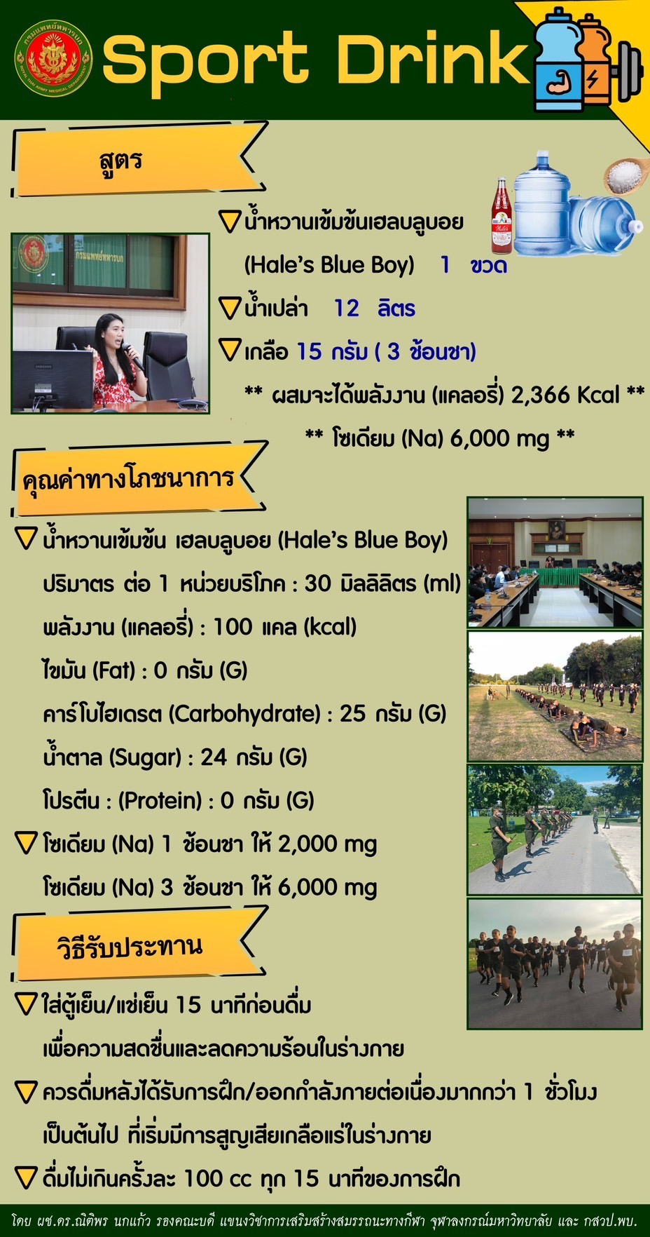 เป็นเครื่องดื่สมเพื่อชดเชยการเสียเหงื่อ ลดโอกาสเกิดการสูญเสียความสมดุลของเกลือแร่ในร่างกายและลดโอกาสการบาดเจ็บจากร้อน โดยเป็นเครื่องดื่มที่อิงสูตรต้นแบบของกรมแพทย์ทหารบก โดยจัดทำในรูปแบบน้ำบรรจุขวดพร้อมดื่ม