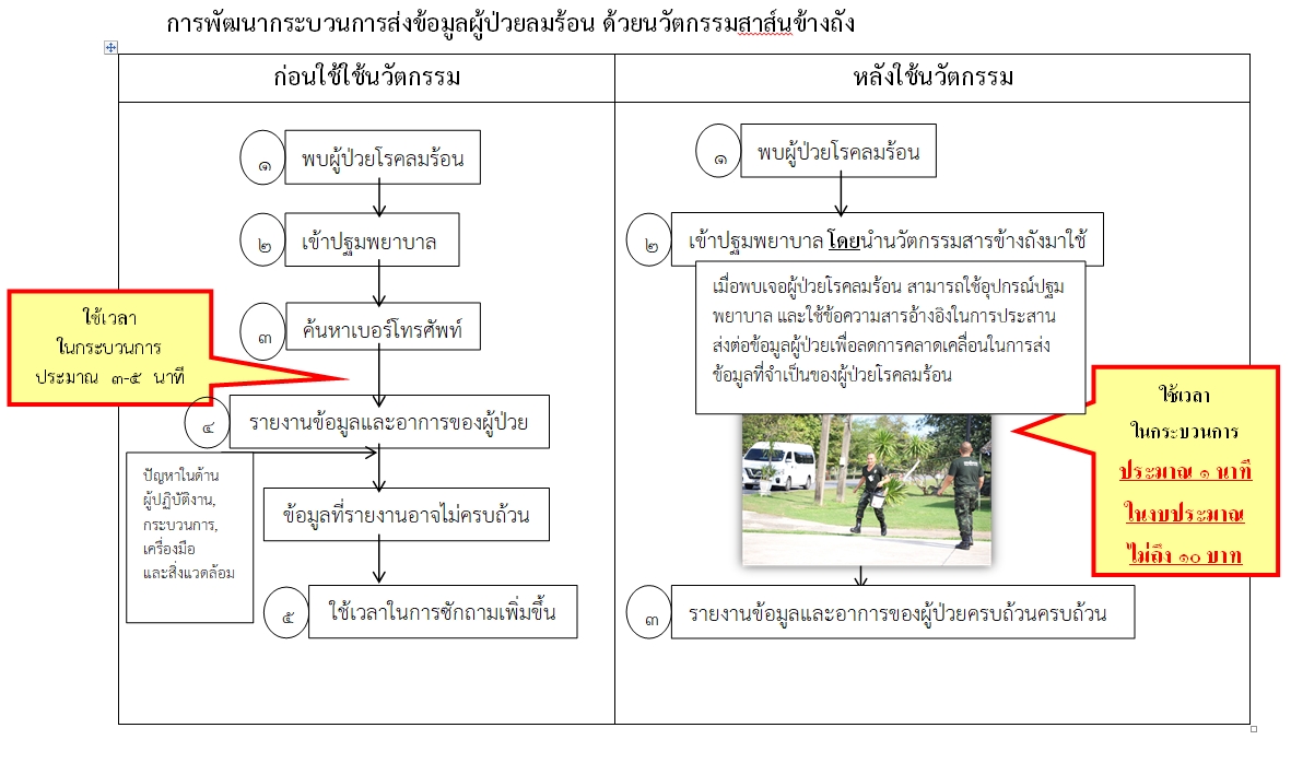 "สาส์นข้างถัง" เป็นการพัฒนาระบบงานจากการสื่อสารระหว่างหน่วยกับบุคลากรทางการแพทย์ โดยการส่งข้อมูลผู้ป่วยโรคลมร้อน ตามหลักการ ISBAR เพื่อให้การส่งต่อข้อมูลที่ถูกต้อง ครบถ้วน ทำให้บุคลากรทางการแพทย์สามารถประเมินความรุนแรงของโรคได้เบื้องต้นอย่างถูกต้อง มีการเตรียมความพร้อมอุปกรณ์และทีมรักษาอย่างทันถ่วงทีทำให้ผู้ป่วยได้รับการรักษาที่มีประสิทธิภาพ รวดเร็วและปลอดภัย อีกทั้งยังหน่วยสามารถปฐมพยาบาลและได้รับคำแนะนำในการดูแลปฐมพยาบาลผู้ป่วยเมื่อเกิดภาวะแทรกซ้อนขณะขณะส่งต่อได้ถูกต้อง