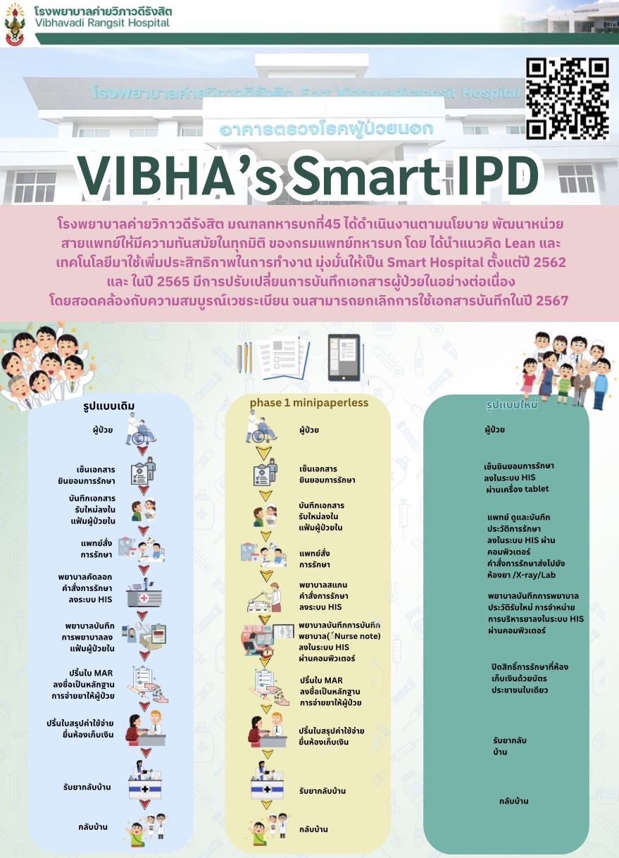 โรงพยาบาลค่ายวิภาวดีรังสิต ขับเคลื่อนการดำเนินงานสู่การเป็น Smart Hospital นำเทคโนโลยีมาใช้เพิ่มประสิทธิภาพในการทำงาน พัฒนาระบบ "IPD Paperless" ผู้ป่วยในไร้เอกสาร ช่วยลดการใช้กระดาษ ลดพื้นที่ในการจัดเก็บ และลดความเสี่ยงเกิดข้อผิดพลาดจากการทำงาน