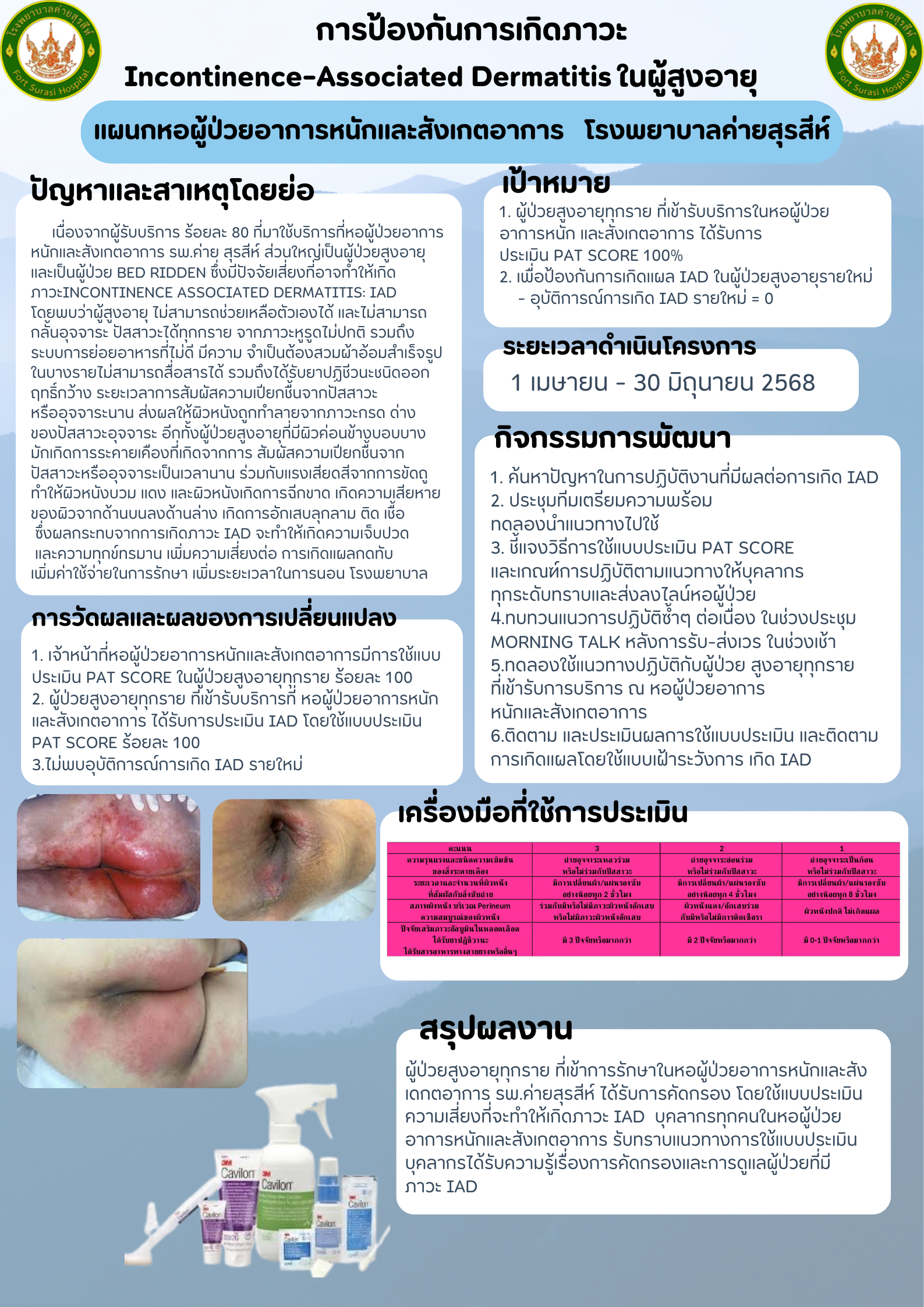 เนื่องจากผู้รับบริการ ร้อยละ 80 ที่มาใช้บริการที่หอผู้ป่วยอาการหนักและสังเกตอาการ รพ.ค่ายสุรสีห์ ส่วนใหญ่เป็นผู้ป่วยสูงอายุ และเป็นผู้ป่วย Bed ridden ซึ่งมีปัจจัยเสี่ยงที่อาจทำให้เกิดภาวะ Incontinence Associated Dermatitis: IAD โดยพบว่าผู้สูงอายุ ไม่สามารถช่วยเหลือตัวเองได้ และไม่สามารถกลั้นอุจจาระ ปัสสาวะได้ทุกกราย จากภาวะหูรูดไม่ปกติ รวมถึงระบบการย่อยอาหารที่ไม่ดี มีความจำเป็นต้องสวมผ้าอ้อมสำเร็จรูป ในบางรายไม่สามารถสื่อสารได้ รวมถึงได้รับยาปฏิชีวนะชนิดออกฤทธิ์กว้าง ระยะเวลาการสัมผัสความเปียกชื้นจากปัสสาวะ หรืออุจจาระนาน ส่งผลให้ผิวหนังถูกทำลายจากภาวะกรด -ด่าง ของปัสสาวะอุจจาระ อีกทั้งผู้ป่วยสูงอายุที่มีผิวค่อนข้างบอบบาง มักเกิดการระคายเคืองที่เกิดจากการสัมผัสความเปียกชื้นจากปัสสาวะหรืออุจจาระเป็นเวลานาน ร่วมกับแรงเสียดสีจากการขัดถู ทำให้ผิวหนังบวม แดง และผิวหนังเกิดการฉีกขาด เกิดความเสียหายของผิวจากด้านบนลงด้านล่าง เกิดการอักเสบลุกลาม ติดเชื้อ ซึ่งผลกระทบจากการเกิดภาวะ IAD จะทำให้เกิดความเจ็บปวด และความทุกข์ทรมาน เพิ่มความเสี่ยงต่อการเกิดแผลกดทับ เพิ่มค่าใช้จ่ายในการรักษา เพิ่มระยะเวลาในการนอน โรงพยาบาล จากเหตุผลดังกล่าวข้างต้น ทางหอผู้ป่วยอาการหนักและสังเกตอาการ จึงเล็งเห็นความสำคัญของการป้องกันการภาวะ IAD จึงได้นำแบบประเมินความเสี่ยง มาใช้กับผู้ป่วยที่เสี่ยงต่อการเกิดภาวะ IAD และการทำความสะอาดอย่างถูกต้อง เพื่อป้องกันการเกิดภาวะ IAD ในผู้สูงอายุ