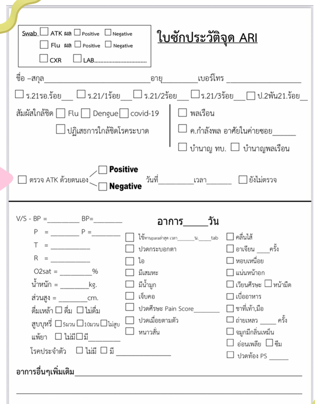 - นำใบซักประวัติแนบไว้กับเล่มเวชระเบียนของผู้ป่วย เพื่อให้ทราบว่าผู้ป่วยรายนี้เป็นผู้ป่วยที่มีอาการระบบทางเดินหายใจ รอตรวจอยู่ในพื้นที่ ARI clinic